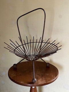 Le fer forgé, brut, patiné, laisse apparaître tout le geste de l’artisan. Le maillage fin du fond donne à l’ensemble une légèreté visuelle qui contraste avec la densité du métal. Sur pieds, il peut être utilisé comme porte revue , bien sûr, mais aussi comme corbeille à fruit ou simple sculpture décorative dans un intérieur contemporain ou campagne-chic.