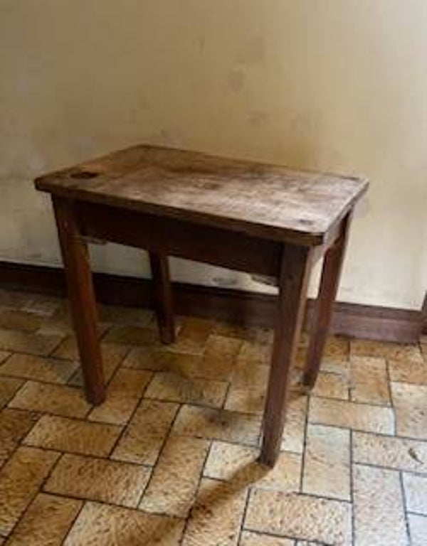 Ce bureau et cette chaise table ancienns en bois massif séduit par sa patine chaleureuse, ses pieds légèrement fuselés et son tiroir central. il y a la place pour mettre un encrier