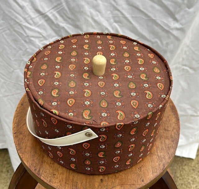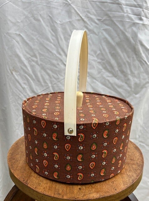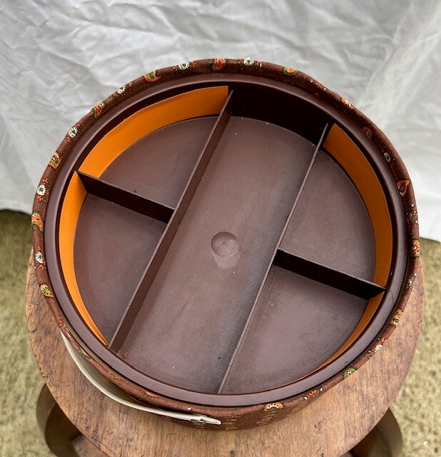 Magnifique boîte à ouvrage tapissée années 70 de forme ronde
