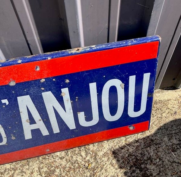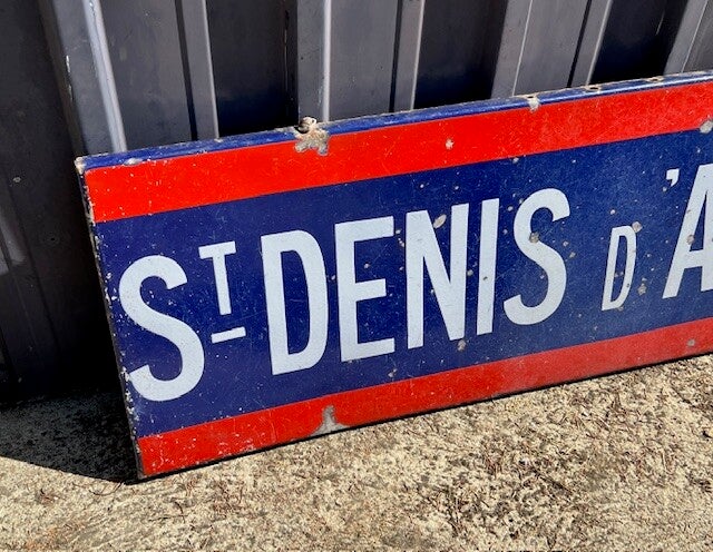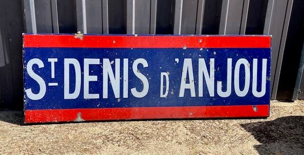 Ancienne grande plaque émaillée signalisation routier SAINT DENIS D'ANJOU, utilisée entre 1940 et 1945